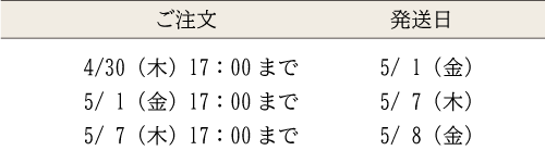※各日、ご注文受付は17:00で締め切らせていただいております。締切時間以降のご注文は、翌営業日受付分となります。